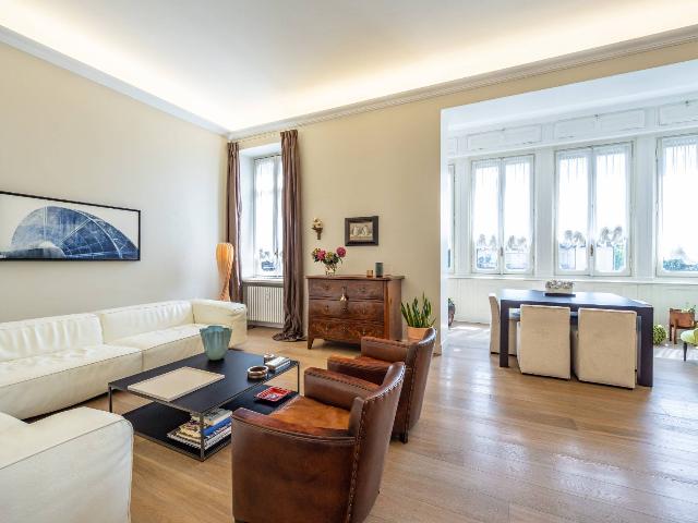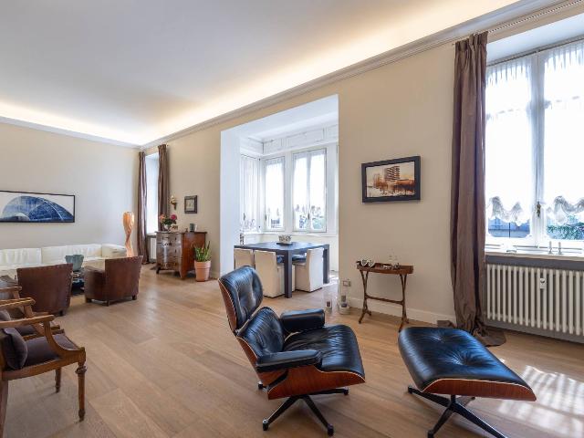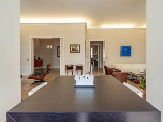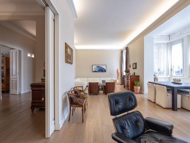 In splendido stabile d'epoca, in Via Lamarmora, nel tratto compreso tra Via Valeggio e Via Governolo, esclusivo appartamento al terzo piano con ascensore completamente ristrutturato composto da ingresso, luminosissimo salone doppio con bow window, cucina abitabile con isola e zona pranzo, tre camere molto ampie di cui una attualmente adibita a studio, una doppia con zona notte, cabina armadio e bagno privato e suite matrimoniale con bow window e vasca di design a vista, zona armadi, cabina armadio e bagno privato, terzo bagno ospiti tre bagni, lavanderia e ripostiglio e appendiabiti. Completa la proprietà una cantina e una soffitta. Categoria Catastale A/2.