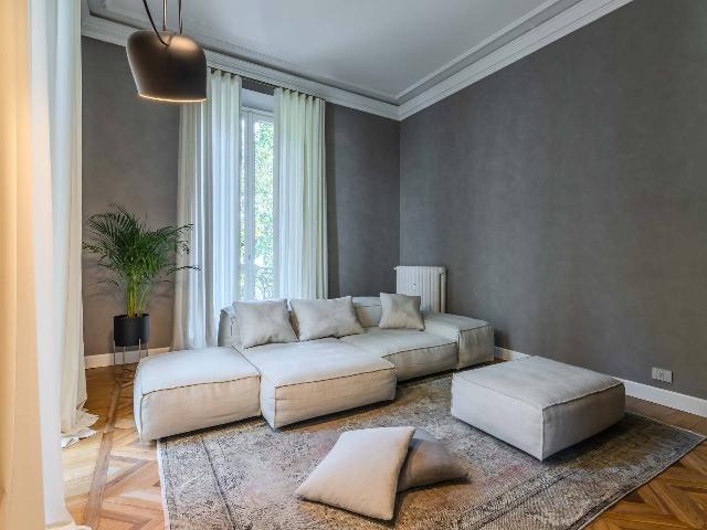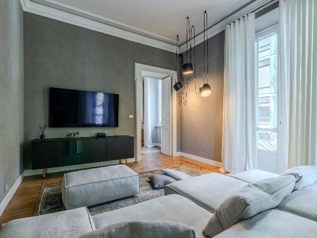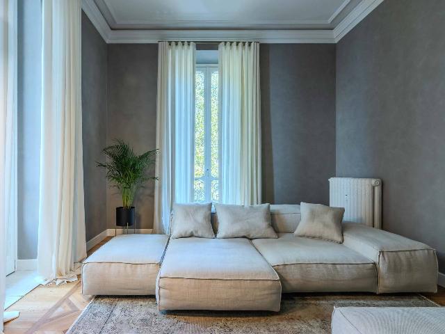 In stabile d'epoca in perfette condizioni, al piano secondo splendido appartamento angolare di circa 210 mq, composto da ingresso con elegante boiserie di design dedicata a vestiaire per gli ospiti/ripostiglio, salone, sala da pranzo, sala relax, cucina in marmo di Carrara, due camere, due bagni e lavanderia.L'appartamento è stato oggetto di una completa ristrutturazione nel 2022 con materiali di pregio e soluzioni di design. Pavimenti originali in legno decorati a quadroni o rombi, seminato con elegante greca perimetrale, marmo nero marquina, sovraporte in bassorilievo, soffitti impreziositi da stucchi decorativi, originali doppie porte a battente.Possibilità di acquistare tutti gli arredi presenti di alto standard, quali credenza Ceccotti, tavolo Porro, sedie Carl Hansen e poltrone Cassina, divani Living, librerie artigianali modello Le Corbusier, corpi illuminanti Traiano luce marca Flos, Atollo, Taccia, pianoforte Kaway, ecc. Completa la proprietà una cantina al piano interrato di circa 20 mq.L'ubicazione nel quartiere residenziale di Cit Turin, comoda alla metro Principi d'Acaja, alla stazione Porta Susa e al Tribunale oltre a tutti i servizi, rende ottimale la scelta anche per finalità di investimento.Cat A/3 RCEuro 1103,93Ape classe E EPgl,nren kmh/m2anno 128.73