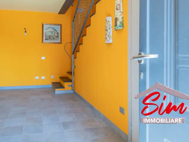 La casa si sviluppa su tre livelli: al piano terra troviamo un ampio ingresso utilizzabile per vari scopi e con il ripostiglio sottoscala dove si trova l'impianto di aspirazione centralizzato. Il locale è dotato anche di una finestra sul lato opposto all'accesso dal cortile, eventualmente trasformabile in passaggio diretto alla strada esterna.