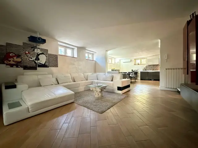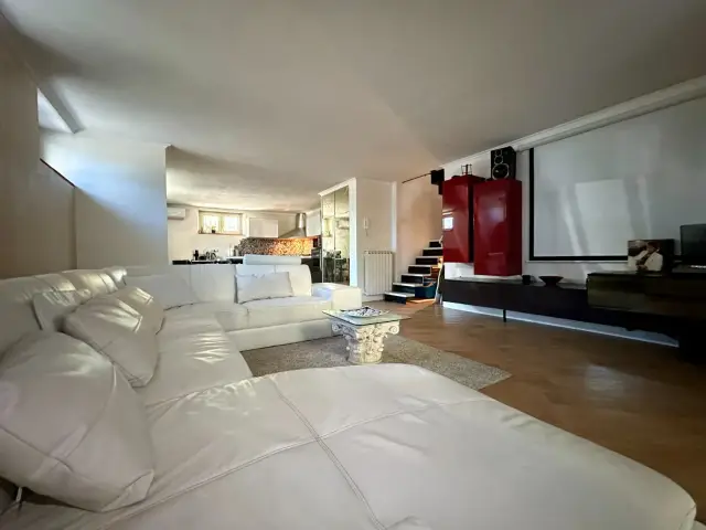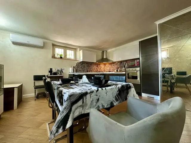 Scendendo al piano inferiore, troviamo una splendida taverna, adibita come una cucina e soggiorno moderni ed eleganti, perfetta per momenti di relax e convivialità. Da qui si accede a una resede tergale e a un ripostiglio esterno, aggiungendo ulteriore spazio funzionale alla proprietà. L'appartamento è dotato di un impianto di climatizzazione caldo/freddo in tutte le stanze, garantendo comfort durante tutto l'anno, e di una caldaia appena sostituita.