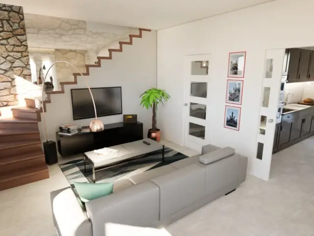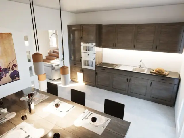 Zona living open-space con cucina e pranzo (possibilità divisione ambienti)