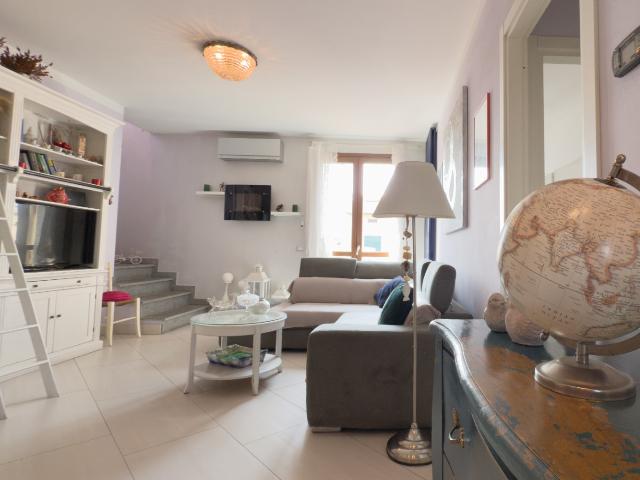 Dal soggiorno, una scala in muratura conduce al piano superiore mansardato, completamente rifinito in grès porcellanato effetto legno, dove si sviluppa la zona notte: una camera matrimoniale, due camerette, un secondo bagno finestrato con box doccia e un utile angolo armadio/ripostiglio.