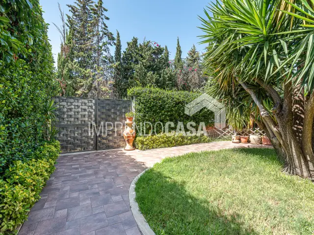 Accedendo dal cancello privato si entra in un giardino di circa 110 mq, in parte piastrellato e in parte a prato, arricchito da una palma ornamentale.