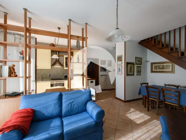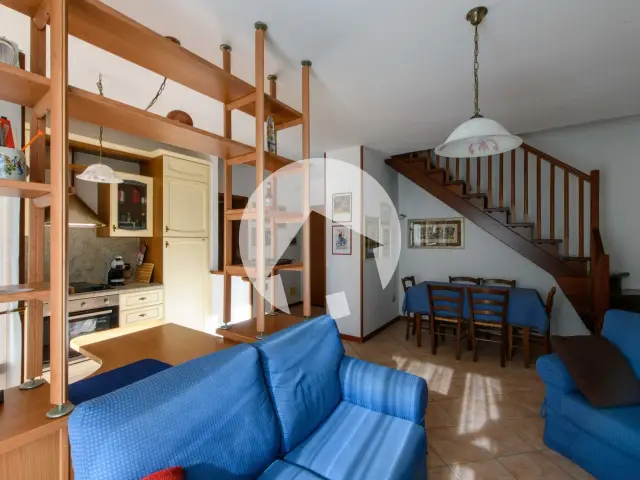 Il soggiorno con angolo cottura rappresenta il cuore della casa, pensato per momenti di convivialità e relax, mentre la disposizione su due livelli assicura una netta distinzione tra zona giorno e zona notte, offrendo privacy e praticità a tutta la famiglia.