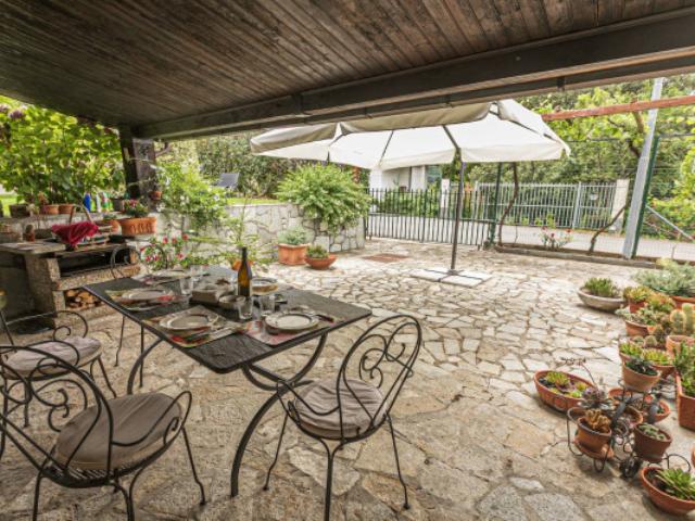 L’esterno è un vero angolo di paradiso: ampio giardino piantumato, piscina privata, terrazza solarium, zona pranzo all’aperto con forno a legna e barbecue, ideali per momenti conviviali e di relax in ogni stagione.