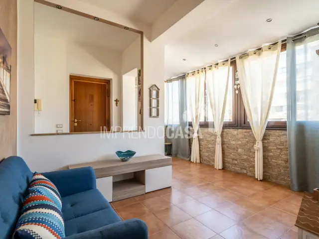 La disposizione interna comprende un ingresso su disimpegno, una saletta accogliente, cucina, camera matrimoniale, cameretta, un bagno con box doccia in vetro, ripostiglio, veranda di 30 mq e un ampio balcone panoramico vista mare di 15 mq.