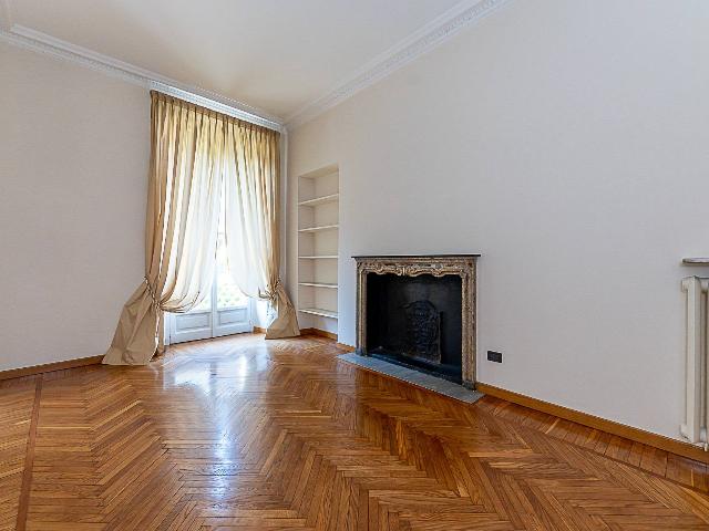 L'appartamento è posto al secondo piano ed è internamente composto da un ampio ingresso, un salone doppio dal quale si accede ad un'altra camera attualmente adibita a stanza da pranzo dotata di uno splendido camino d'epoca, una cucina abitabile, tre camere da letto (delle quali una dotata di un wc), due bagni, un comodo ripostiglio adibito a cabina armadi attrezzata, tre balconi di cui due con affaccio sul corso Palestro e l'altro sul cortile interno.