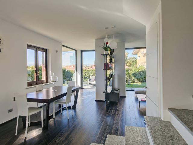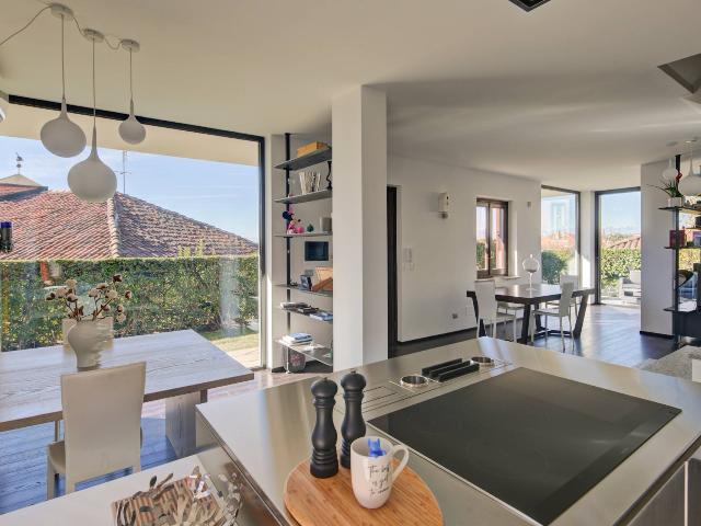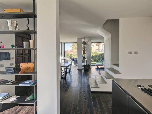 -Piano Terra: L'ingresso si apre su una spaziosa zona giorno open space caratterizzata da un design contemporaneo, che integra armoniosamente una cucina a isola di pregio (Rossana Cucine), una zona pranzo e un'accogliente area divani. Le grandi vetrate di recente installazione inondano gli ambienti di luce naturale, creando un'atmosfera ariosa, da esse si può accedere al bel giardino che costeggia tutta la proprietà.
