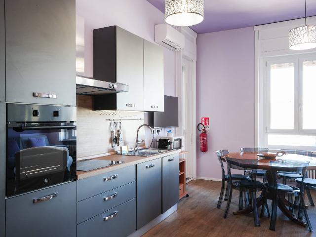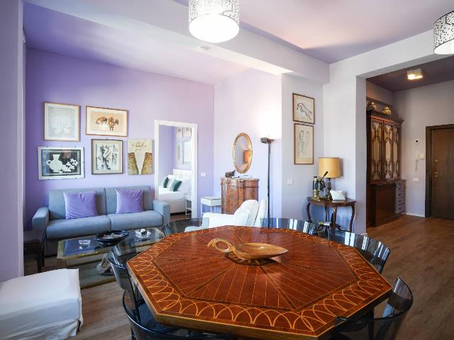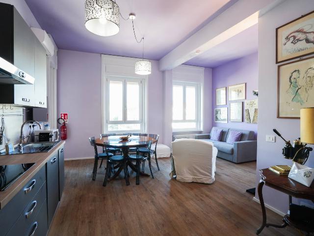 Si propone con soluzione di affitto transitorio un nuovissimo trilocale situato al quarto piano composto di: ampio salotto e sala pranzo con balcone, due camere da letto, una camera con balcone privato, cucina a vista, un bagno. L'appartamento è molto luminoso e spazioso. Gli arredi e gli accessori sono tutti nuovi. L'appartamento è fornito di aria condizionata.