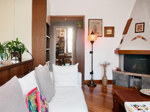 L’ingresso, completo di un comodo soppalco ideale come spazio aggiuntivo per ripostiglio o organizzazione, conduce a una cucina abitabile con balcone affacciato sulla corte interna, dalla quale si gode una piacevole vista panoramica verso Piazza Gae Aulenti. Il luminoso e accogliente soggiorno è impreziosito da un suggestivo camino a legna perfettamente funzionante e da un secondo balcone con affaccio su Via Pietro Maroncelli.