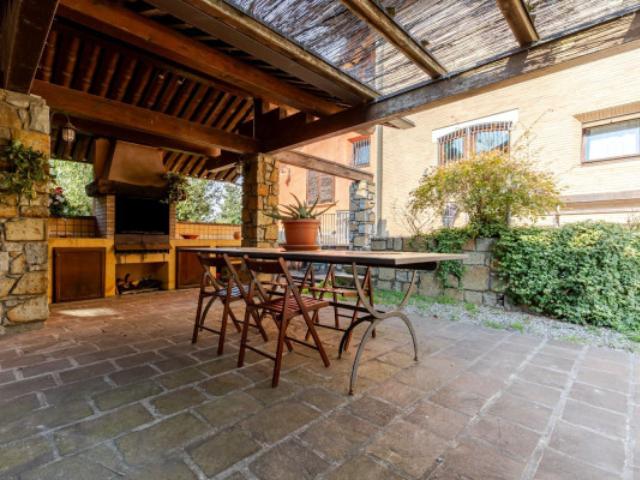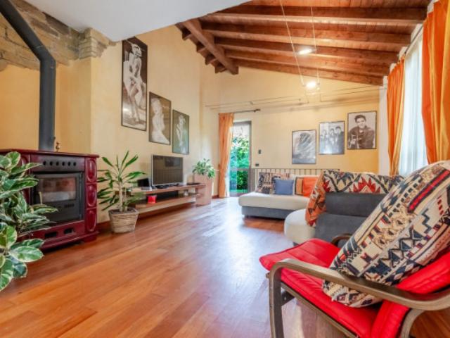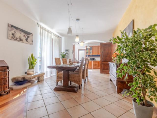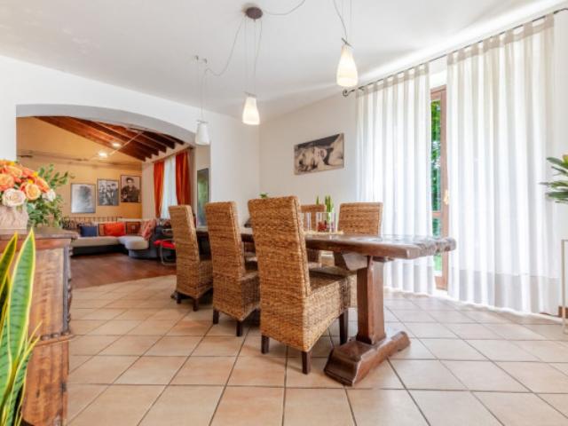 Entrando al piano terra, si viene accolti da un ingresso che ci conduce ad un'ampia zona giorno composta da un soggiorno di 22 mq, caratterizzato da una suggestiva stufa in maiolica rossa che dona calore e personalità all'ambiente, una sala da pranzo di ulteriori 19 mq e una cucina luminosa e ben organizzata, il cui arredo è compreso nel prezzo. Gli spazi della zona giorno sono ampi e ben distinti, ideali per la vita familiare e per accogliere ospiti in un'atmosfera conviviale, grazie anche all'affaccio diretto sul giardino esterno direttamente collegato all'abitazione di 190 mq . All'esterno, un portico coperto offre un piacevole spazio da vivere all'aperto, perfetto per pranzi o momenti di relax.