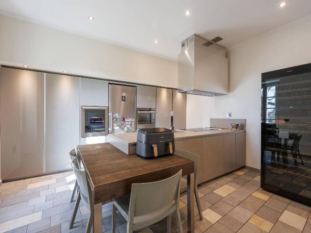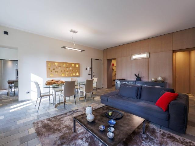 ingresso su zona living con doppio soggiorno, cucina abitabile arredata con cucina su misura ad isola e completa di elettrodomestici di alta gamma, tre camere da letto di cui una con ampia cabina armadio e bagno en suite, due bagni ed una lavanderia.