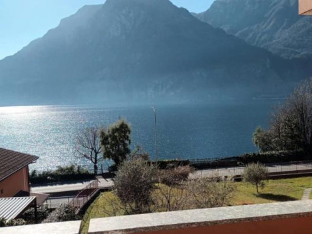 Si accede all'appartamento tramite un ingresso che ci accoglie e ci indirizza verso la zona notte e la zona giorno. Entrando nella zona giorno, si viene colpiti dalla meravigliosa vista lago, godibile anche dal balcone coperto della proprietà. Abbiamo poi la cucina abitabile, ampia e anch'essa molto luminosa. Consideriamo poi la zona notte, costituita da due camere, di cui una con balcone e dal bagno padronale.