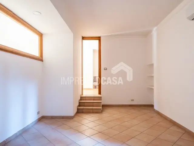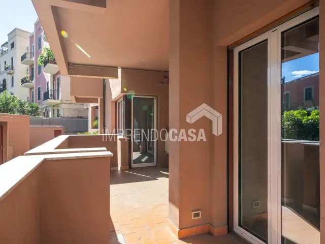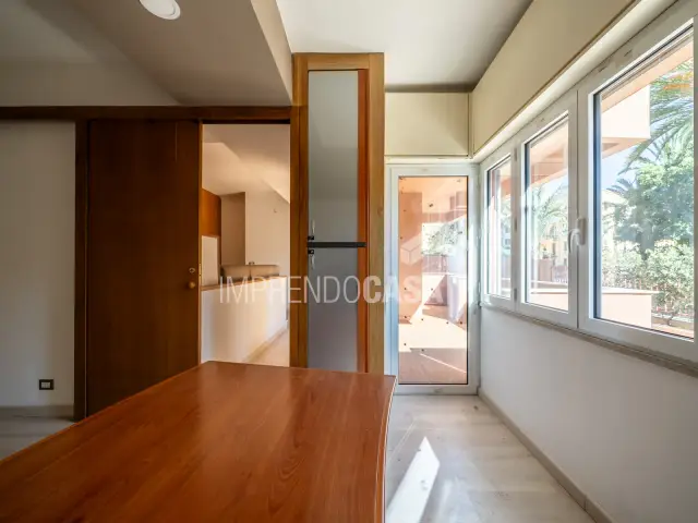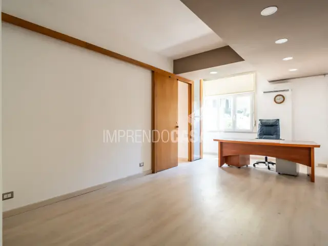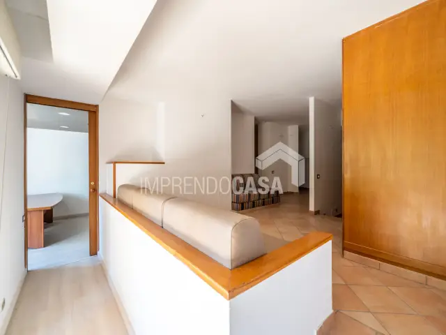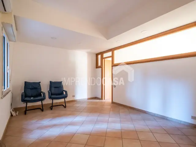 L’immobile è composto da: un ingresso che disimpegna due zone, a destra un ampio studio con doppio accesso, la zona di rappresentanza centrale, un vano utilizzato come segreteria, una stanza intermedia che conduce a un altro vano comodo, camerino e bagno. Due ampi balconi terrazzati affacciano sugli spazi condominiali e possono essere arredati con piante, salottini esterni o trasformati in un giardino d’inverno.