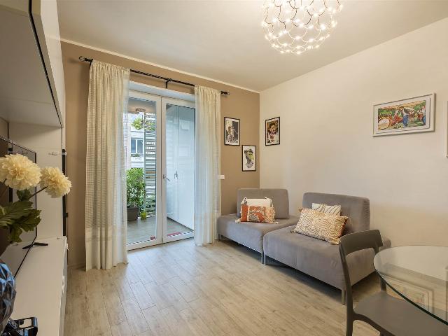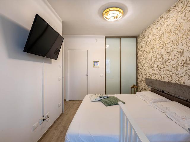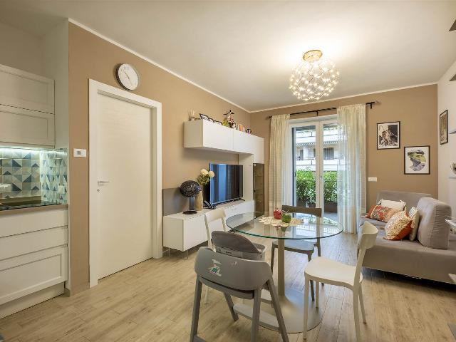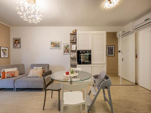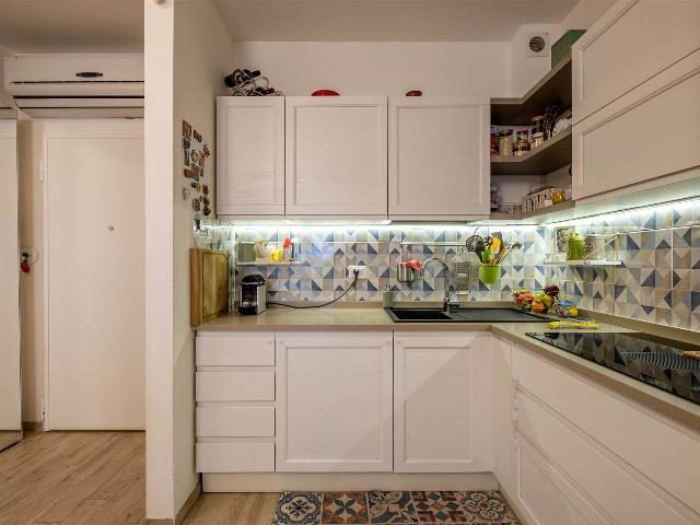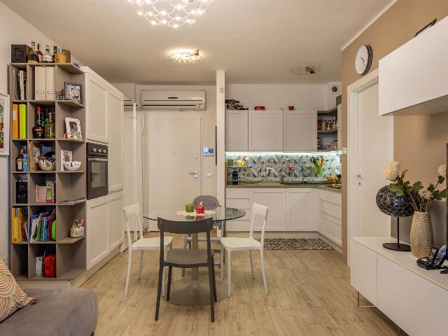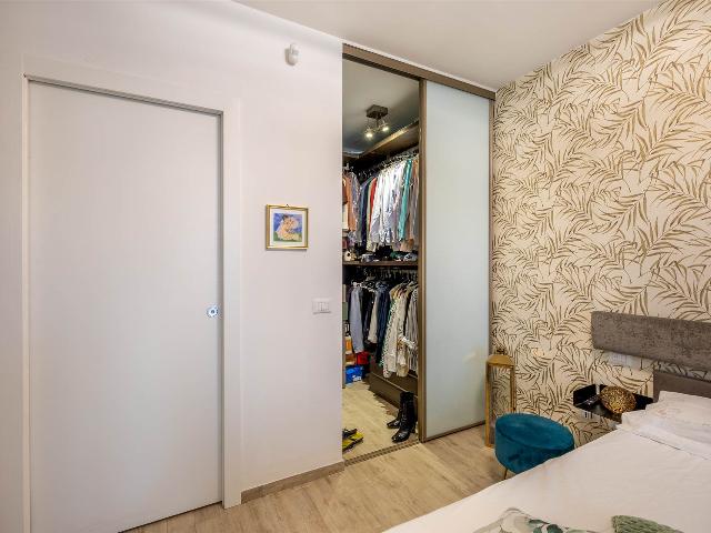 ingresso, soggiorno con cucina a vista, 2 camere da letto di cui una con cabina armadio, 2 bagni con finestra, , Ampia terrazza coperta di 25 mq perfetta per i momenti di relax e convivialità, con accesso dal soggiorno, tende parasole e con due armadiature esterne adibite a lavanderia e ripostiglio.