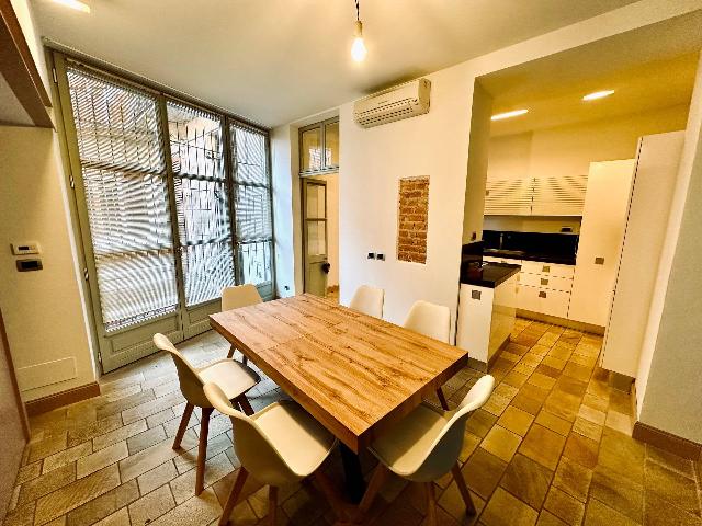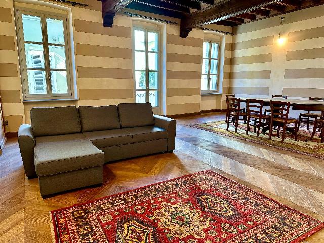 Moncalieri, centro storico, appartamento che mantiene intatto il suo fascino originale grazie ai soffitti a cassettoni e agli alti e luminosi spazi. L'immobile si trova al primo piano di una palazzina di soli due piani, con spese condominiali di 60 euro al mese.