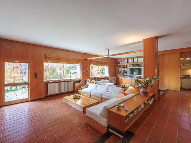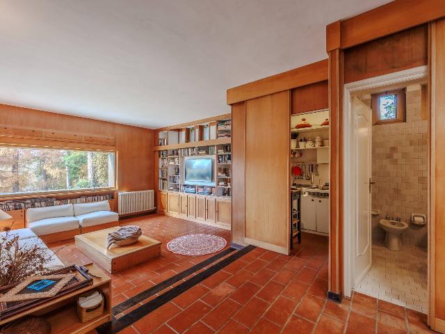 Al secondo livello l'ingresso principale ci conduce in un ampio salone con tripla esposizione e camino centrale, un tinello con camino, cucina, office, studio/biblioteca e bagno di servizio. Dal salone e dalla cucina si accede a un patio coperto, con vista sul prato pianeggiante e sul verde circostante.
