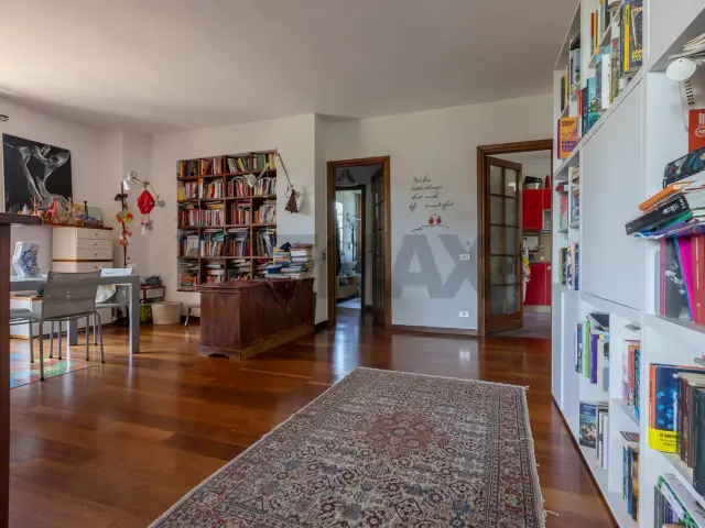 Piano primo: luminoso soggiorno con camino e accesso a una splendida terrazza, sala da pranzo con balcone, disimpegno, cucina, due camere da letto e un bagno.