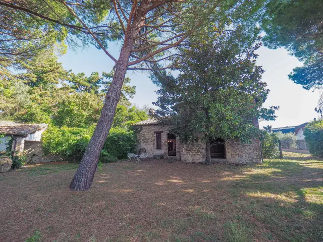 Il giardino di 2000 mq circa è costituito da una corte che separa i due fabbricati sormontata da alberi ad alto fusto e da una parte sottostante il fabbricato da ristrutturare piantumata principalmente ad oliveto.