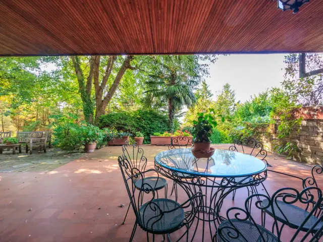La villa è circondata da un giardino piantumato e curato, Il grande portico coperto e la terrazza panoramica creano un naturale prolungamento della zona giorno verso l'esterno.