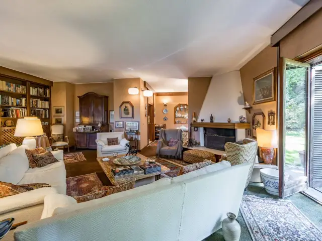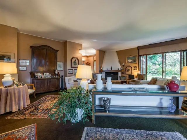 Le grandi vetrate affacciate sul giardino e sul terrazzo coperto conferiscono agli ambienti un'atmosfera luminosa e rilassante.