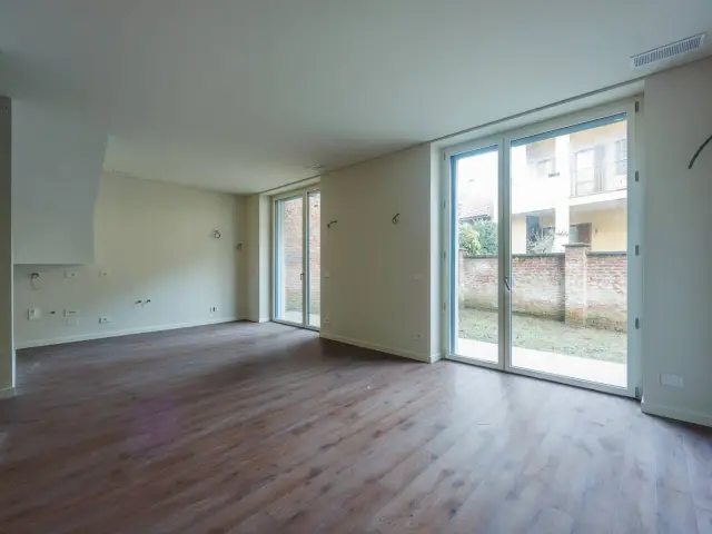 Piano terra: luminoso soggiorno con cucina a vista e affaccio sul giardino privato di 42 mq, bagno.