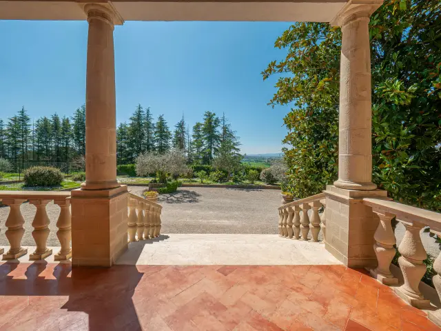 Salendo la maestosa scalinata di marmo, si giunge al primo piano, dove un accogliente ballatoio disimpegna con eleganza la zona notte. Qui troviamo cinque camere da letto e due bagni funzionali. Un vero gioiello di questo piano è la grande terrazza, un affaccio privilegiato sul paesaggio circostante. Da qui, lo sguardo si perde sulla bellezza delle colline umbre, offrendo un panorama che incanta in ogni stagione.