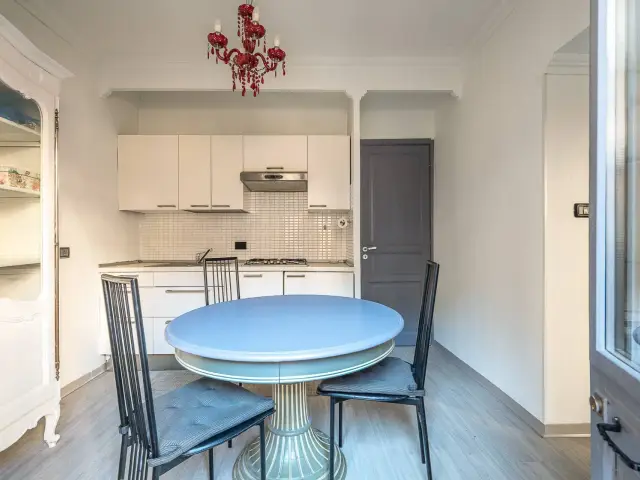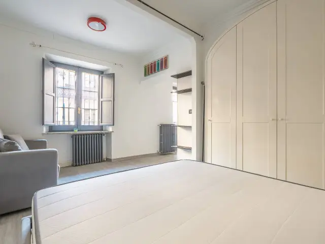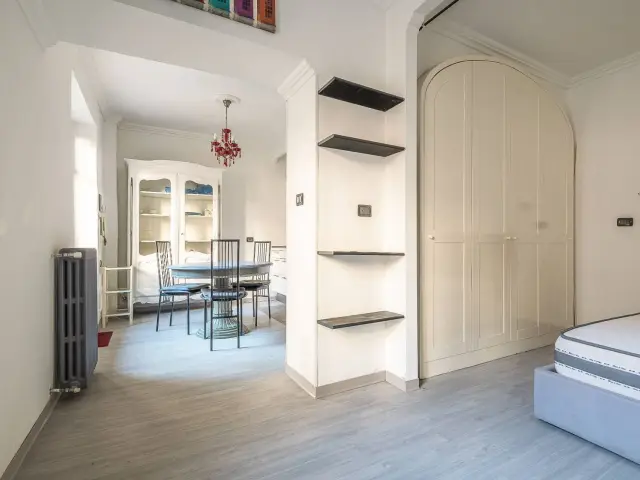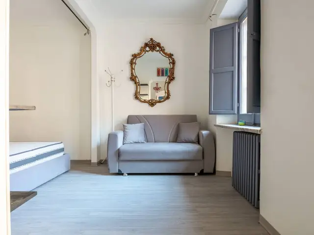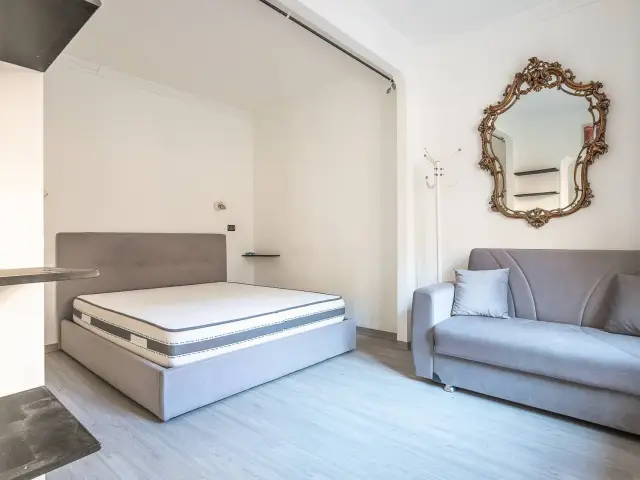 L'immobile si trova al primo piano, con ingresso da ballatoio, di una graziosa palazzina di inizio novecento. Anche se è un monolocale, tramite una sapiente ristrutturazione sono riusciti a dividere internamente gli spazi creando diverse zone parzialmente separate. L'ingresso dà direttamente sulla zona cucina/pranzo, sulla destra troviamo un grazioso angolo salotto, adiacente alla zona notte (separabile tramite tenda). Il bagno è di buone dimensioni ed è completo di lavatrice con carica dall'alto. Nella zona notte è stata realizzata un'armadiatura su misura da un falegname, ottimizzando tutti gli spazi.