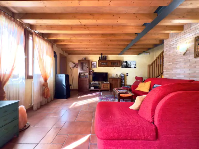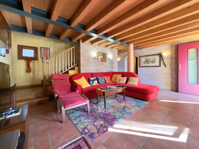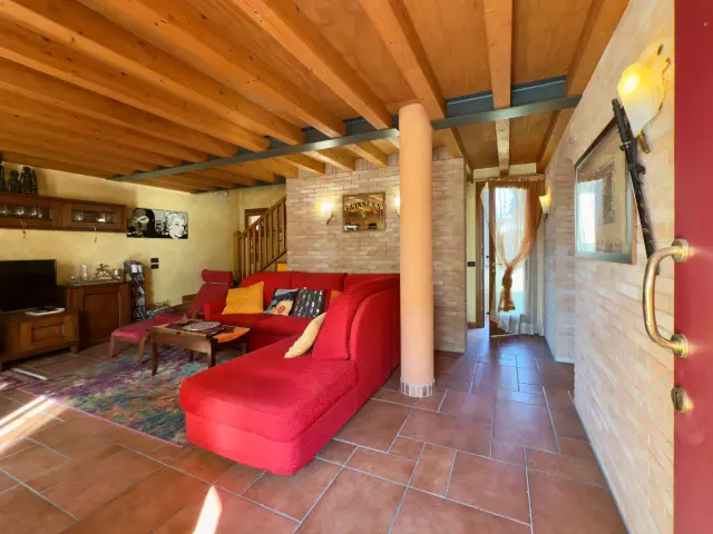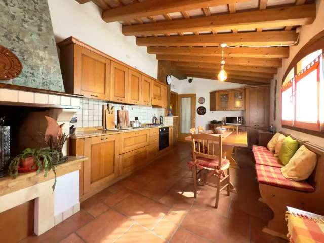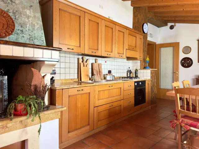 La casa si sviluppa su due livelli, caratterizzati da splendidi soffitti con travi a vista e pavimentazioni in cotto e legno che donano calore a ogni ambiente: