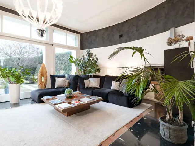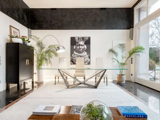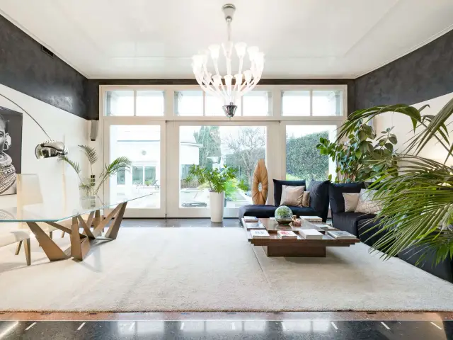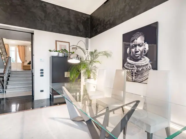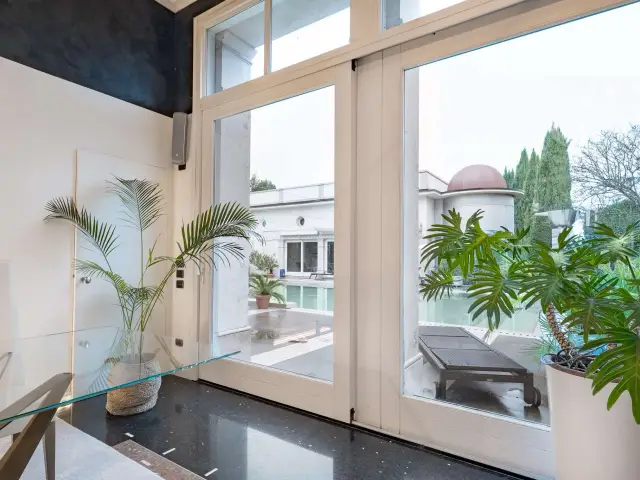 Ogni spazio è stato ricostruito per offrire volumi ariosi e una luce che accarezza i quattro livelli della residenza. Salendo verso l'alto, si scopre il coronamento della villa: una terrazza all'ultimo piano recentemente completata, un osservatorio privato da cui dominare con lo sguardo l'intero parco circostante.